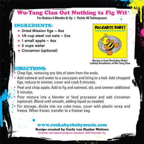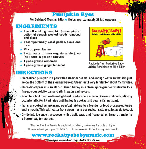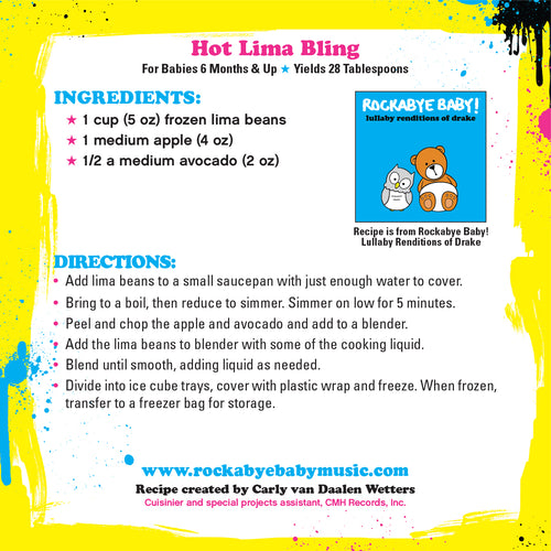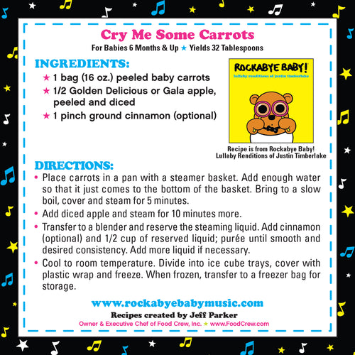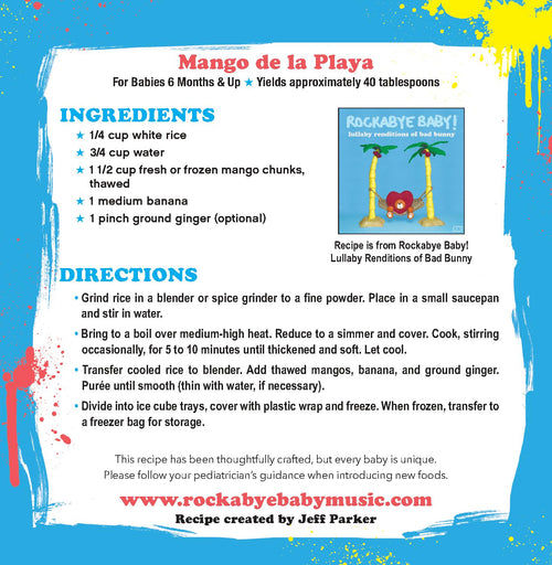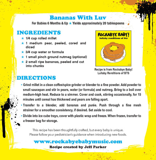 Inside every Rockabye Baby package you'll find artist inspired baby food recipes perfect for any picky young palate. There are a million reasons to make homemade baby food: it's cheaper, it's healthier, but our favorite is that it's easy and fun! Whether yours is a banana baby or a mango munchkin, you're sure to find a crowd-pleaser that will leave your little ones demanding an encore.